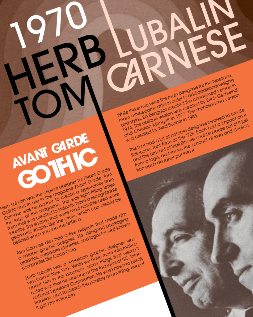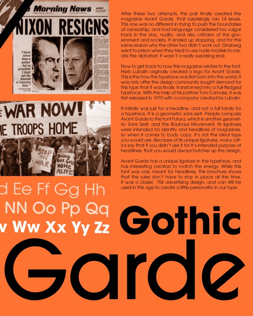 This project explores the bold geometry of the Avant Garde typeface, originally designed in the 1970s. After researching its history and evolution, I crafted a modern brochure that celebrates its iconic structure, using sharp angles and tight kerning to emphasize its typographic rhythm. The orange color choice references its era of origin, paying homage to the visual energy of 1970s editorial design. Through this assignment, I developed a deeper appreciation for geometric and headline-driven typography—Avant Garde became the spark that led me to fall in love with structured, expressive type. The layout balances type and image in a way that’s both nostalgic and contemporary, spotlighting how timeless design can still feel fresh.