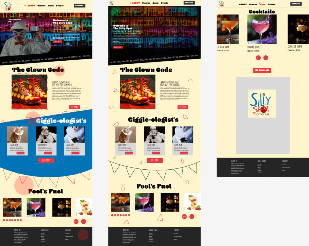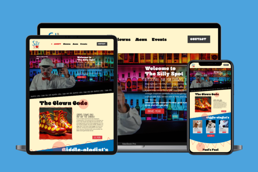 This project was fully hand-coded using HTML, CSS, and JavaScript, and launched through GitHub Pages. The Silly Spot is a fictional bar made for clowns, inspired by vintage circus aesthetics, chaotic fun, and a splash of nostalgia.